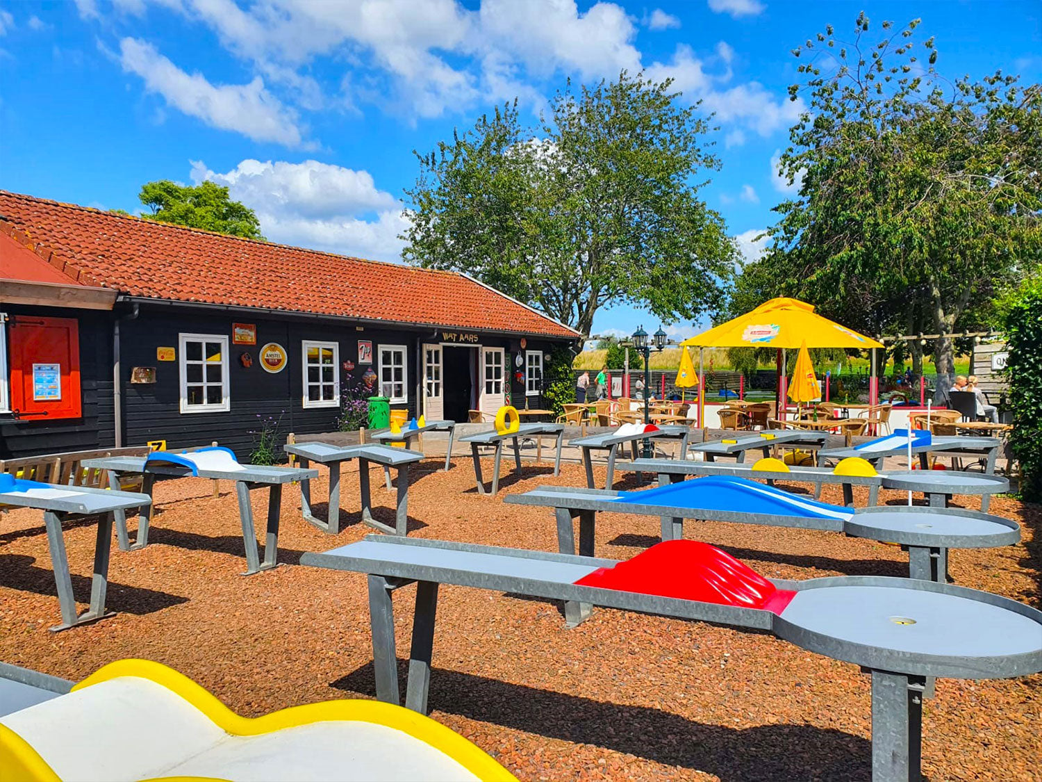 Welkom bij het fraai aangelegde 18-holes midgetgolfpark van WAT AARS! Het park ligt op een prachtige groene locatie aan het Ijsselmeer, waar zonnige plekken en fijne schaduwplekken elkaar afwisselen. Zo geniet iedereen van een ontspannen en gezellige ervaring.